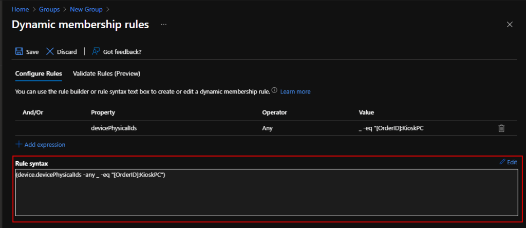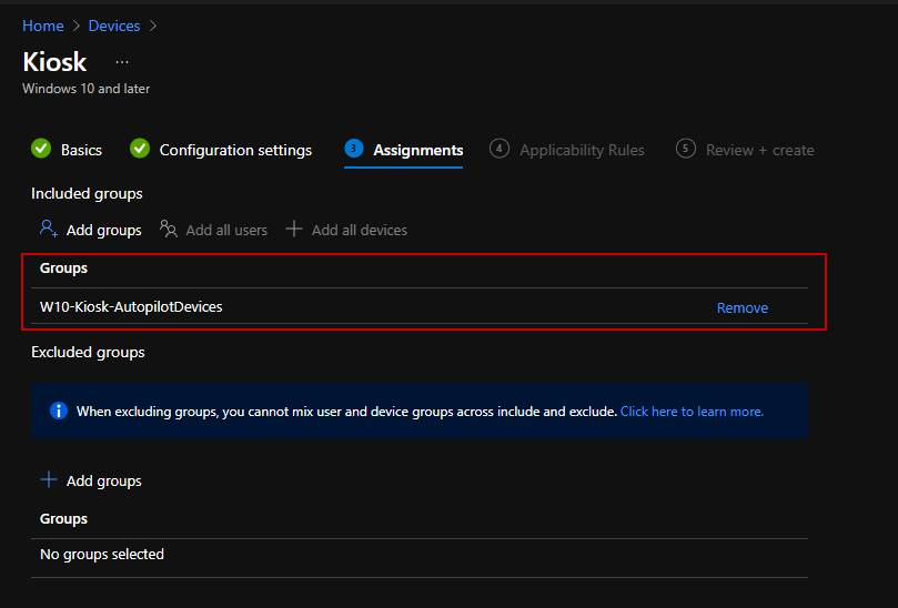 This will automatically add all devices with the group tag “Kiosk PC” to the group. You can specify this group tag when uploading the device hash, but you can also change it in the MEM portal under Devices -> Register Devices -> Devices.