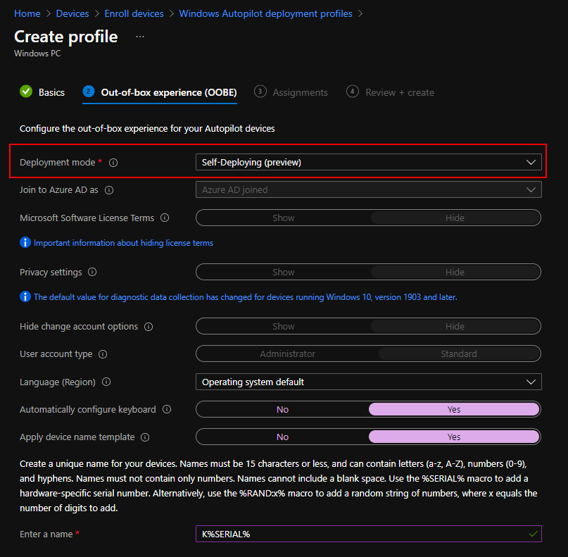 To do this, navigate in the MEM portal to Devices -> Register Devices -> Deployment Profiles.