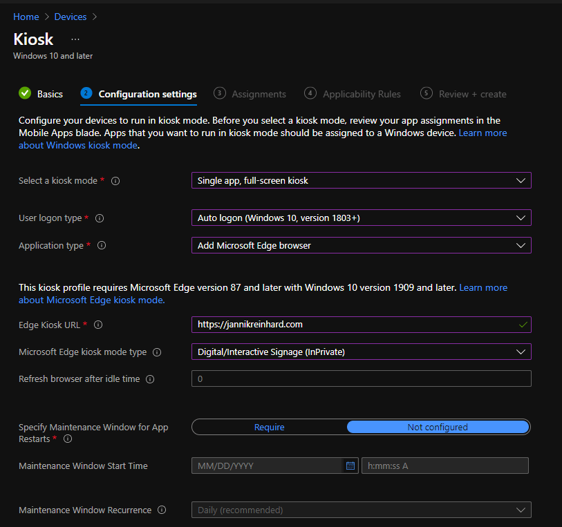 As described above, only one App is started in full screen in this mode and it cannot be exited. To configure this we create a new configuration profile. You can choose between Edge, the Kiosk browser or a Store app. Win32 apps cannot be selected here.