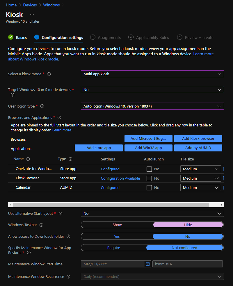 - No: Store apps, Win32 apps, and AUMID apps are allowed in the kiosk profile.