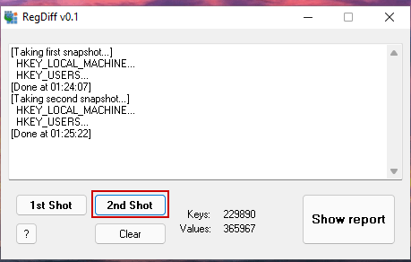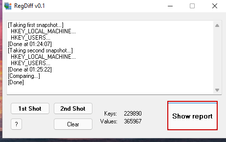 - When this is done we click on Report to view the changes in the registry between the 1st and 2nd snapshot.