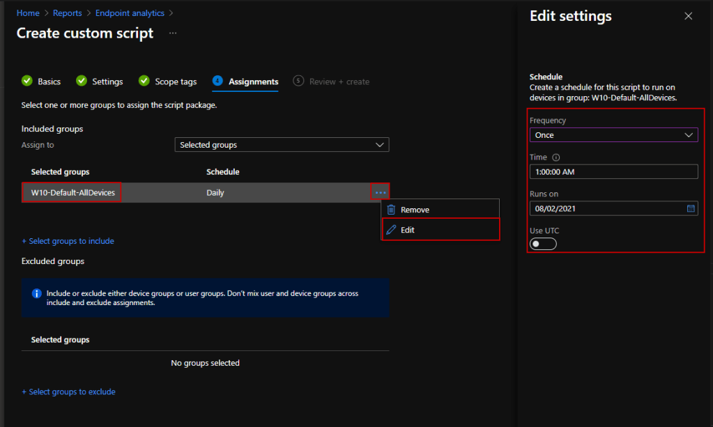 - Assigne the Script to a group and click … and Edit