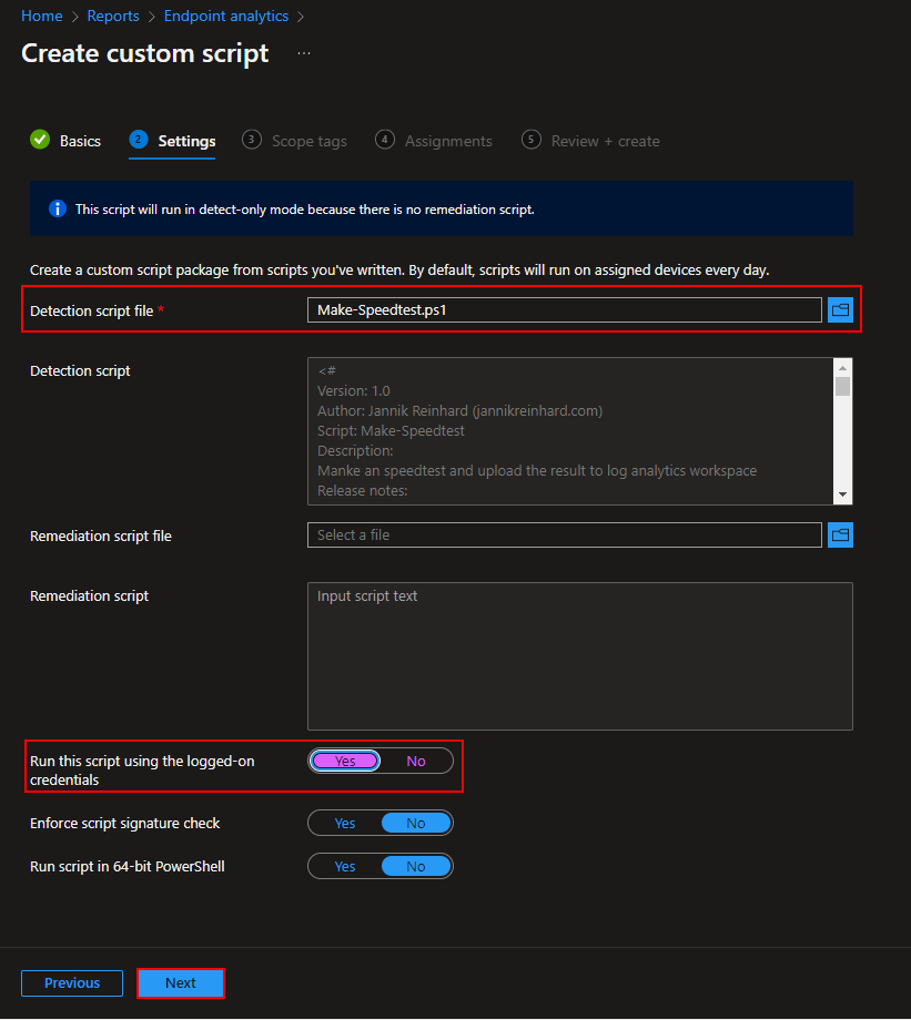- Upload the script as detection script and the remediation script
