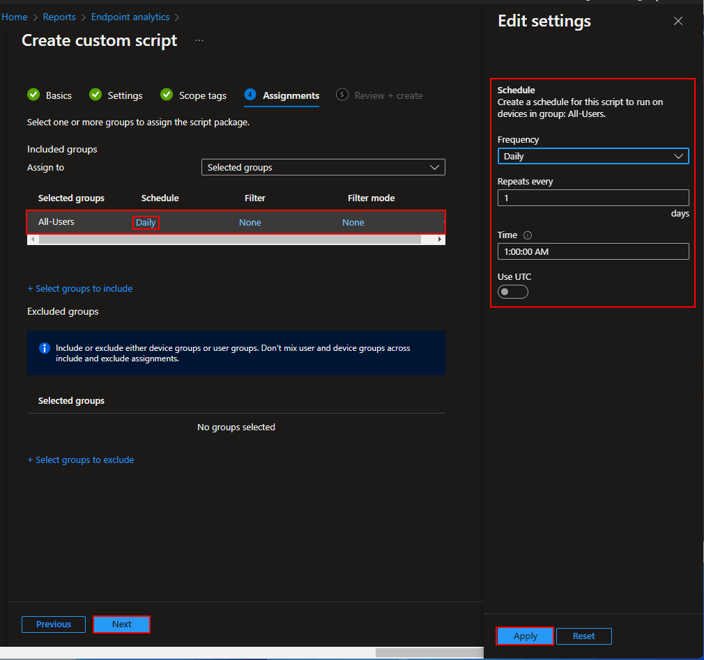 - Assign the Script to a group and click on Daily