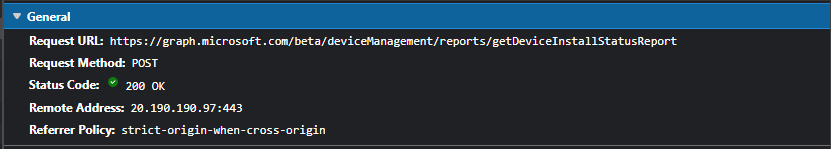 To get this information we start a network trace in the Edge browser and refresh the view. In the trace we get the graph endpoint. The graph endpoint must be called with a POST request with a few parameters in the body to specify the which data we want to receive.