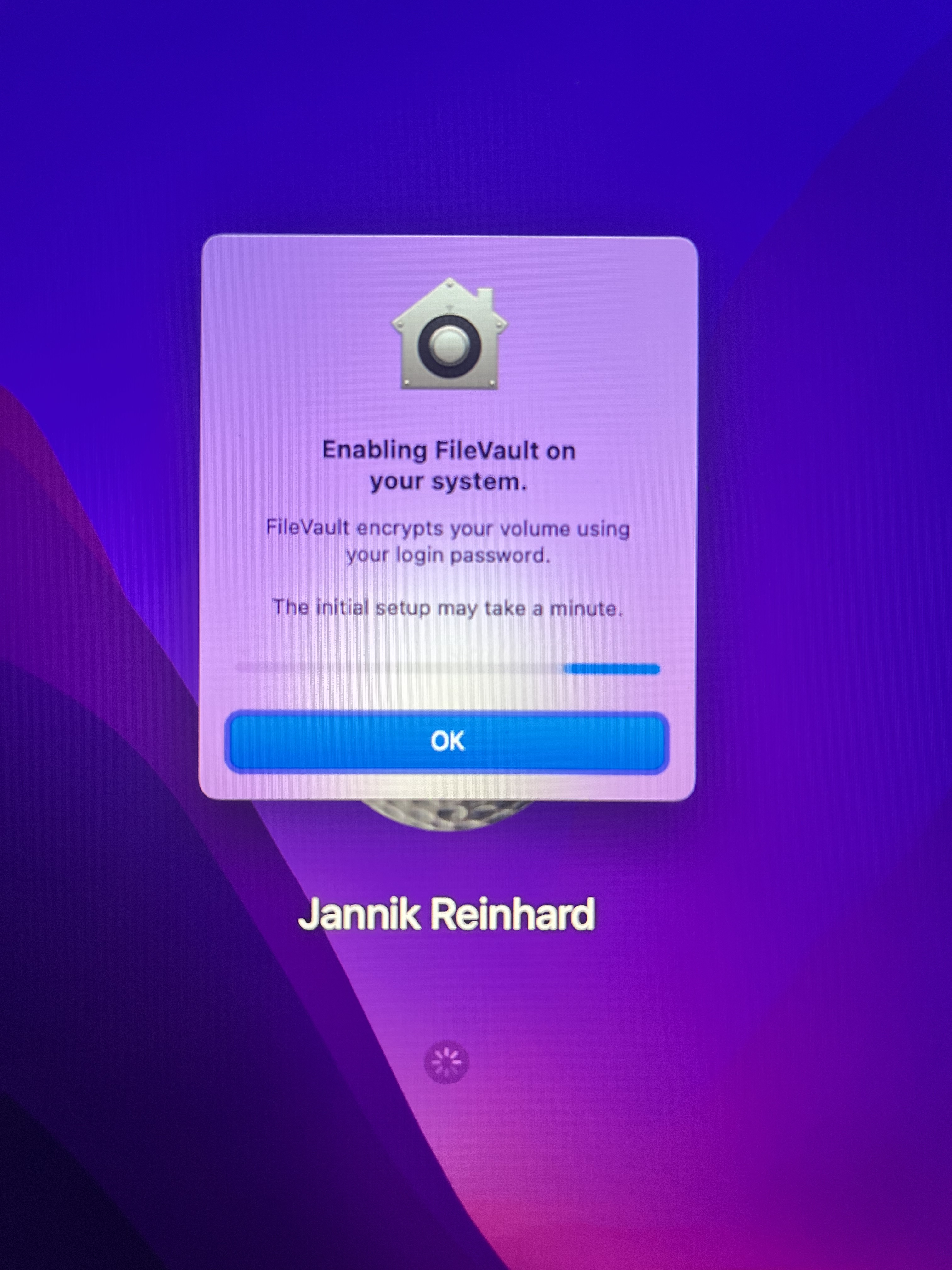 As soon as the Configuration Profile is applied to the device and the user logs in again, he will receive the following popup with the information that the FileVault should be activated. Depending on what you have selected as the value for the setting “Number of times allowed to bypass“, the encryption is then forced: