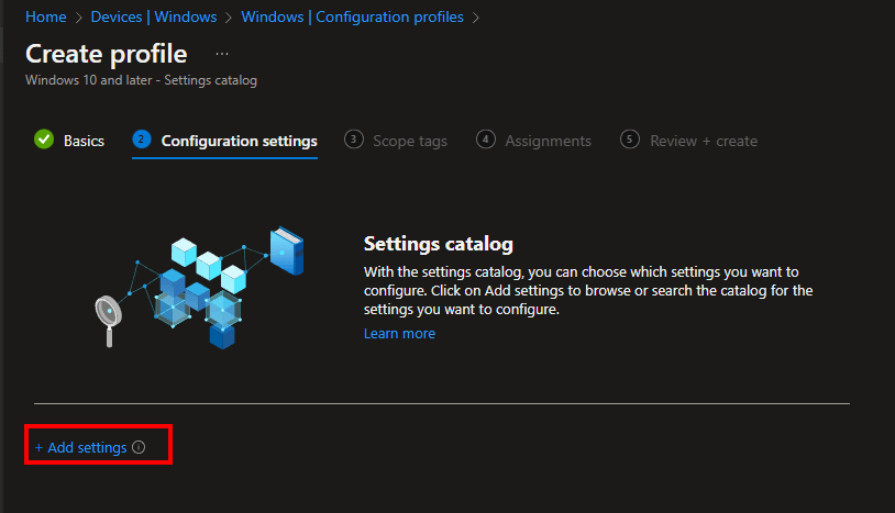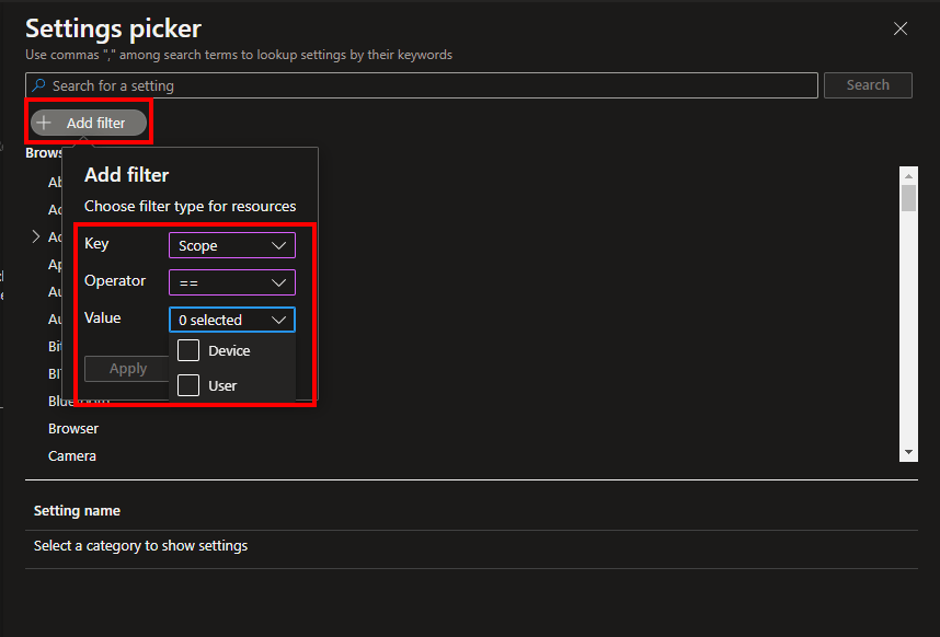 Filter on the user scope or device scope in the Settings Catalog for Windows devices