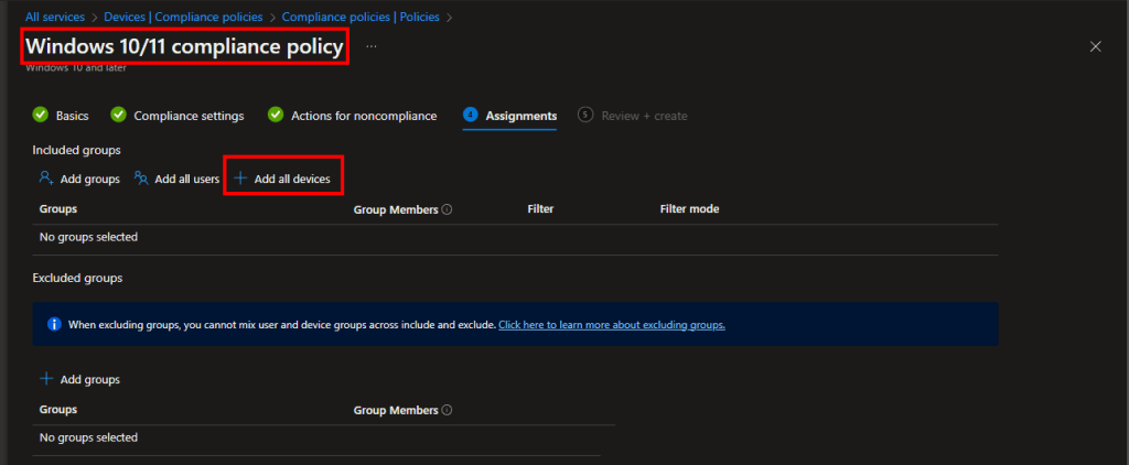 Finally, compliance policies can be assigned not only to specific groups but to allDevices.