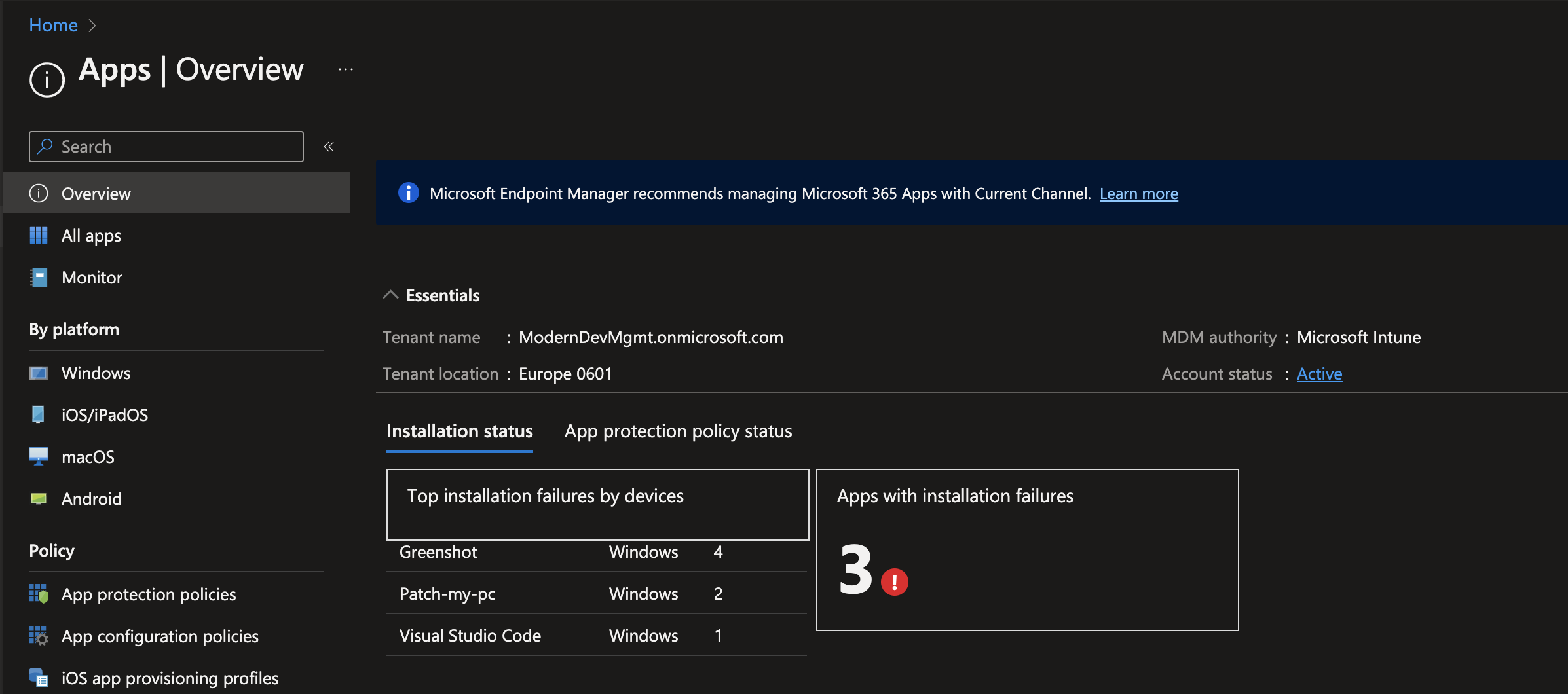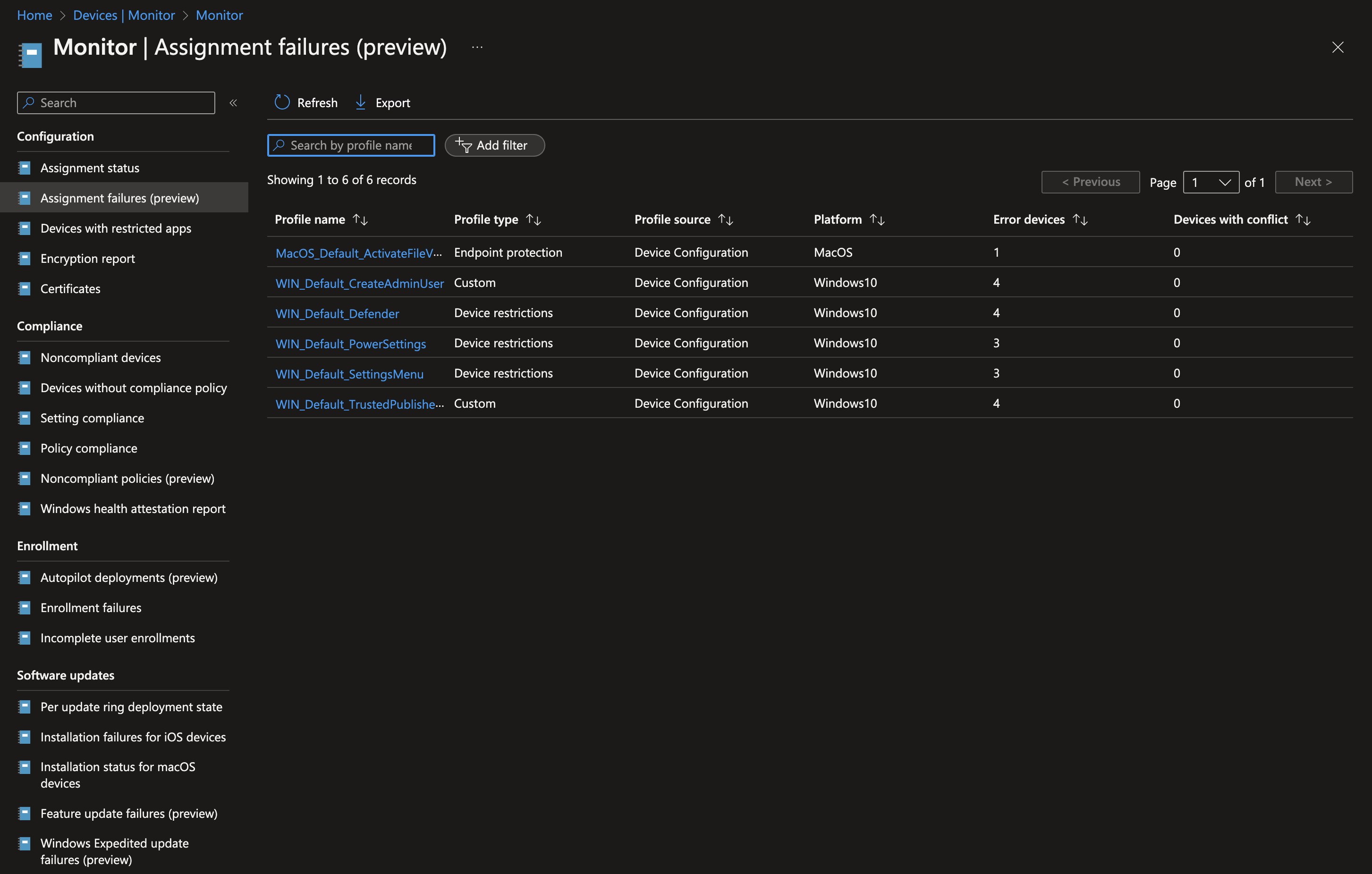 Intune offers a lot of reports that are decentralized in the different categories but there is also a separate report section. The reports help you to see which apps currently have installation problems, which config profiles are on error, the deployment state of update rings and much more.