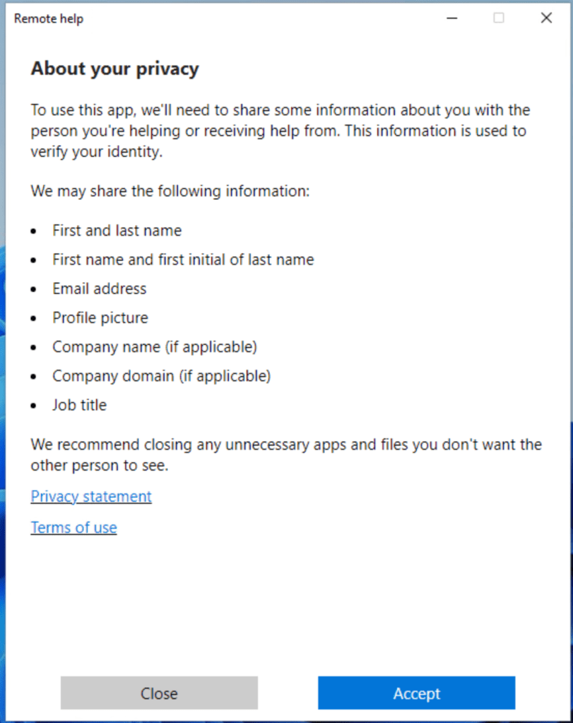 This feature is available for Windows 10/11 users. Both supporter and user are authenticated through Azure Active Directory (Azure AD), which sets up the appropriate trust for remote help sessions.
