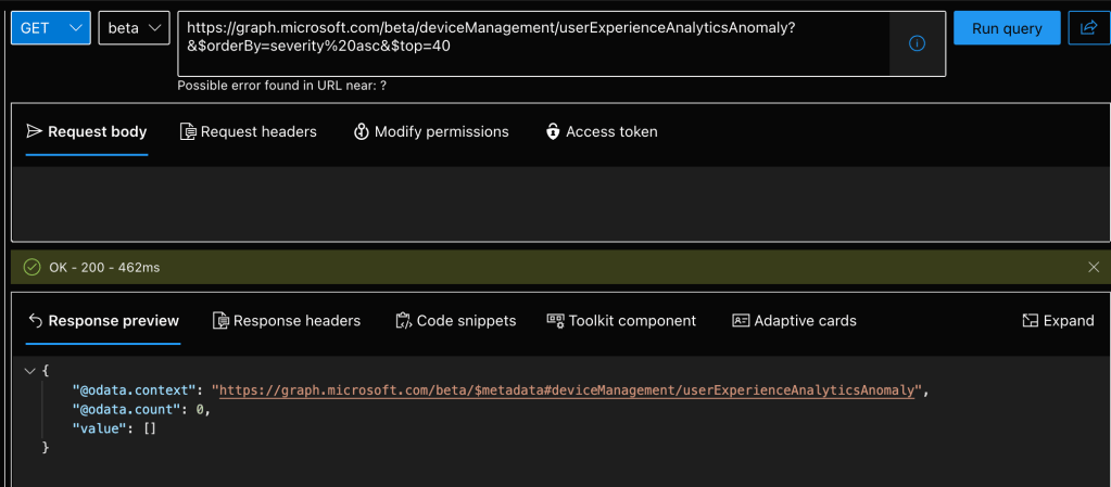 https://graph.microsoft.com/beta/deviceManagement/userExperienceAnalyticsAnomaly?&$orderBy=severity%20asc&$top=40