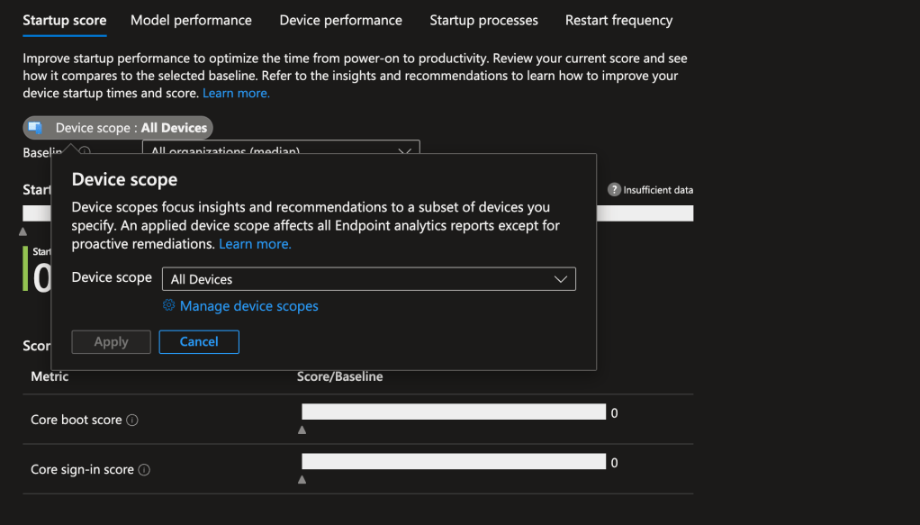 Custom device scopes in Endpoint Analytics use scope tags to slice reports to a subset of devices. This feature enables you to see scores, insights, and recommendations for a specific subset of your enrolled devices. Custom device scopes are supported on the following Endpoint Analytics reports: