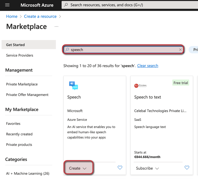 - After reviewing your settings, click “Create” to deploy the Speech service.