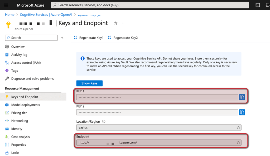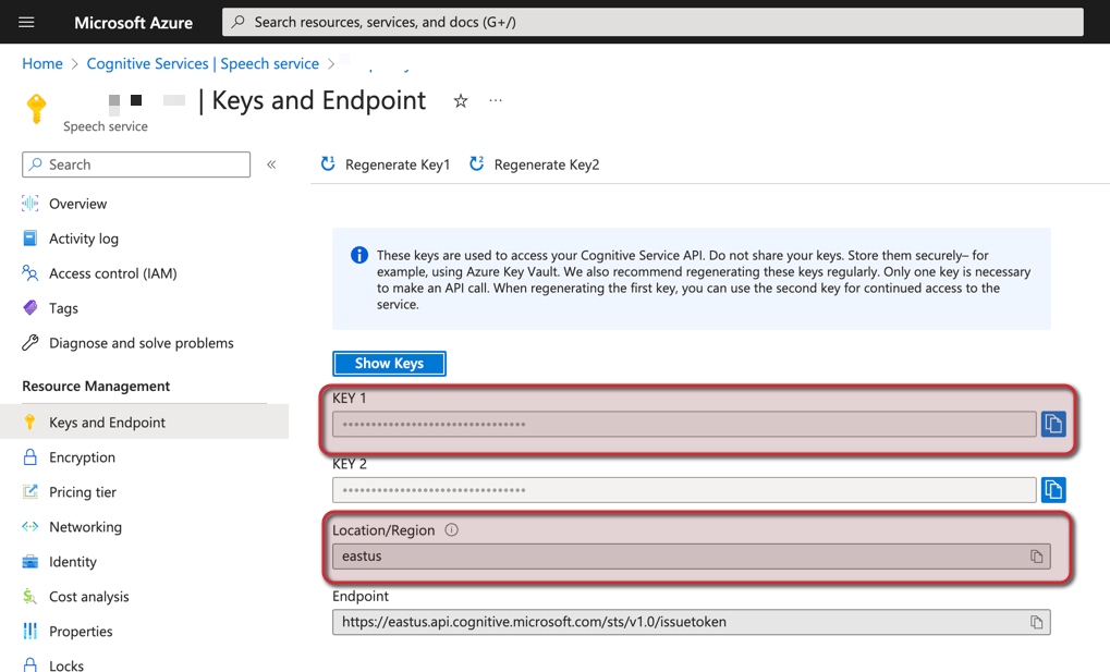 - Once the deployment is complete, navigate to the “Keys and Endpoint” section of the Speech resource. Make a note of the “Key1” and the “Location/Region” as you will need them later to configure the script.