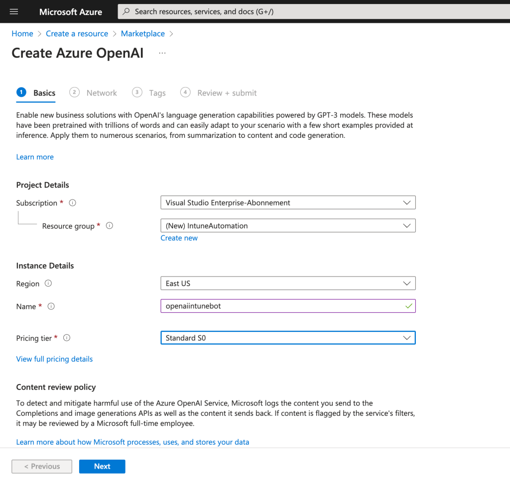 - After reviewing your settings, click “Create” to deploy the OpenAi service.