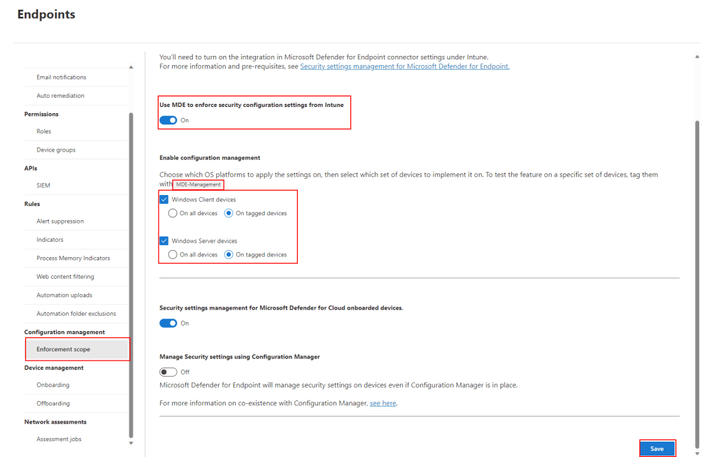 - Activate the “Use MDE to enforce security configuration settings from Intune“