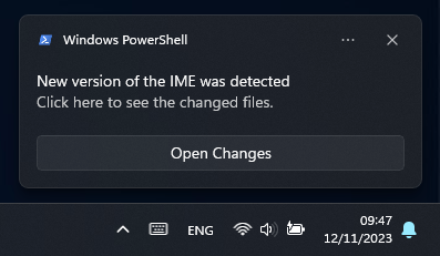 The scripts check at every login if there is an change in one of the dll’s of the IME. If there is an change it shows you an toast notification with an button to an Webpage where you can see which file where changed.
