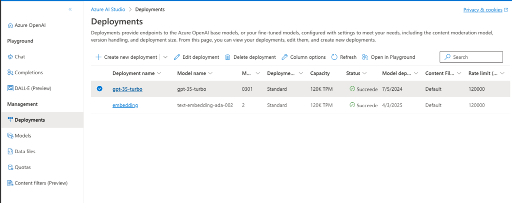 Open the Azure Open AI Studio and create a deployment of an gpt-35-turbo and text-embedding-ada