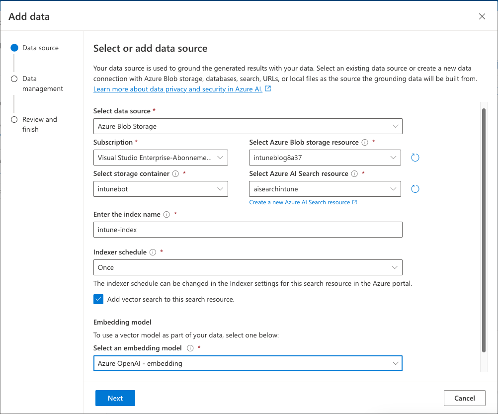 Now we have to configure the connection to the Blob and the Azure AI search. To do this select Azure Blob Storage as data source. After this you have to select the subscription where you blob and your AI search is located. After this you have to enter an name for the index and select an schedule. In my case I do not update the documents regularly for this it is sufficient to create the index once. To get better results we also activate the Add vector search to this search resource flag and select our embedding model. When all this configurations are done you can click Next.