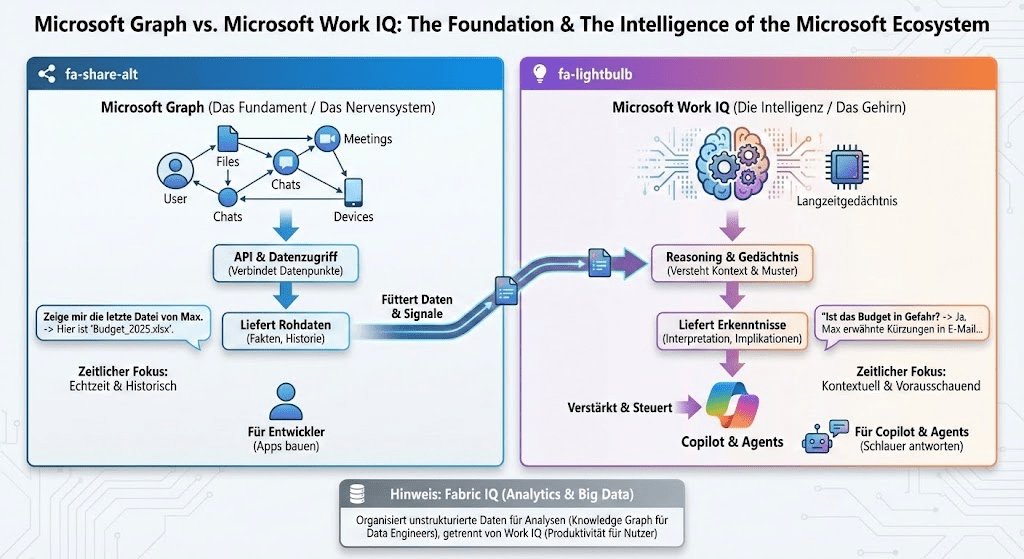 Microsoft Graph is the Foundation – think of it as the nervous system of Microsoft 365. It connects all your data points: Users, Files, Meetings, Chats, Devices. Through its API, you get raw data access – facts and history. When you query “Show me the last file from Max,” Graph returns Budget_2025.xlsx. That’s it.