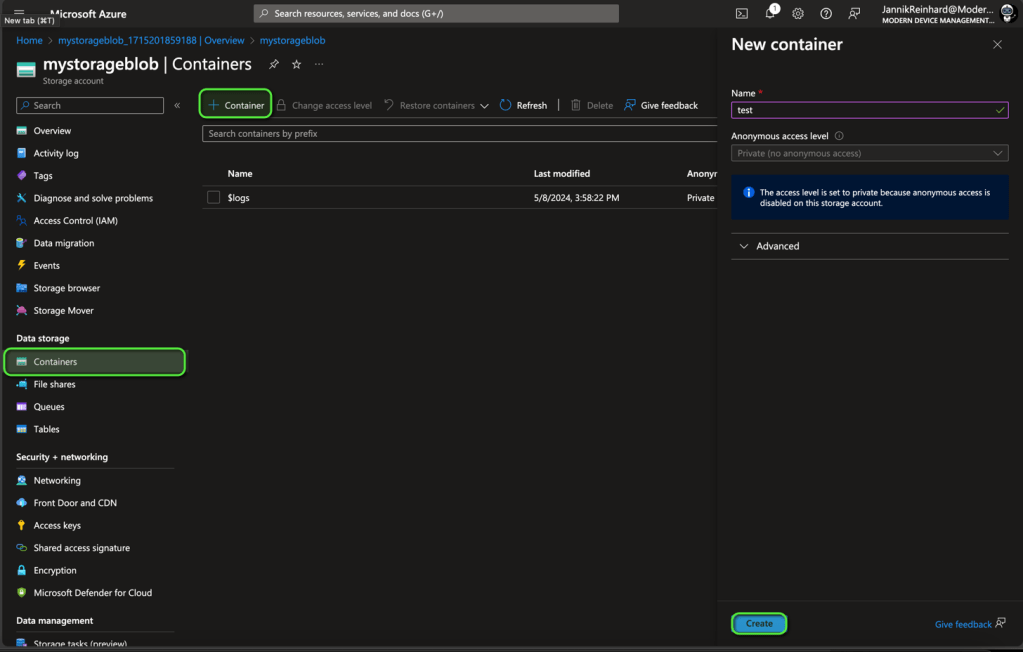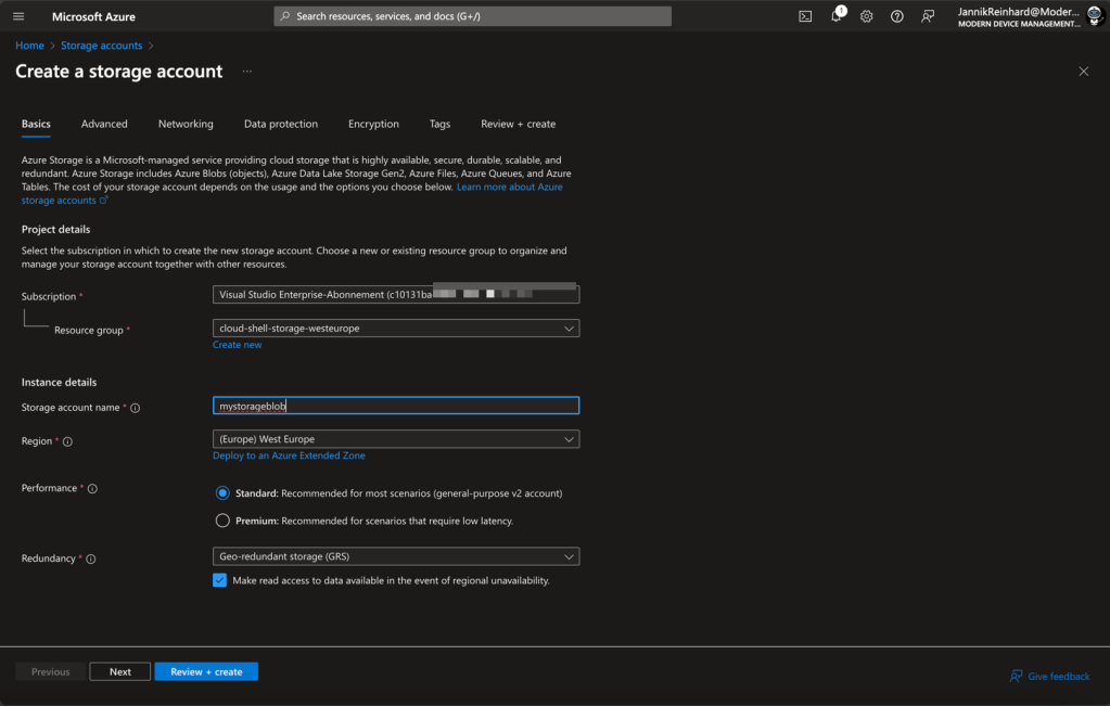 You should also check out all the other setting. (e.g. for a production environment it is recommended to put the storage in a network, enable encryption via customer managed keys as well as configure the data protection.
