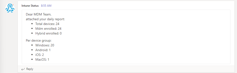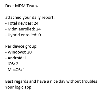 For an Intune admin it is always helpful to get an overview of the current status of his tenant and an overview of the count of devices in the field. In this blog I would like to explain how you can use Logic apps to send you a detailed daily report.