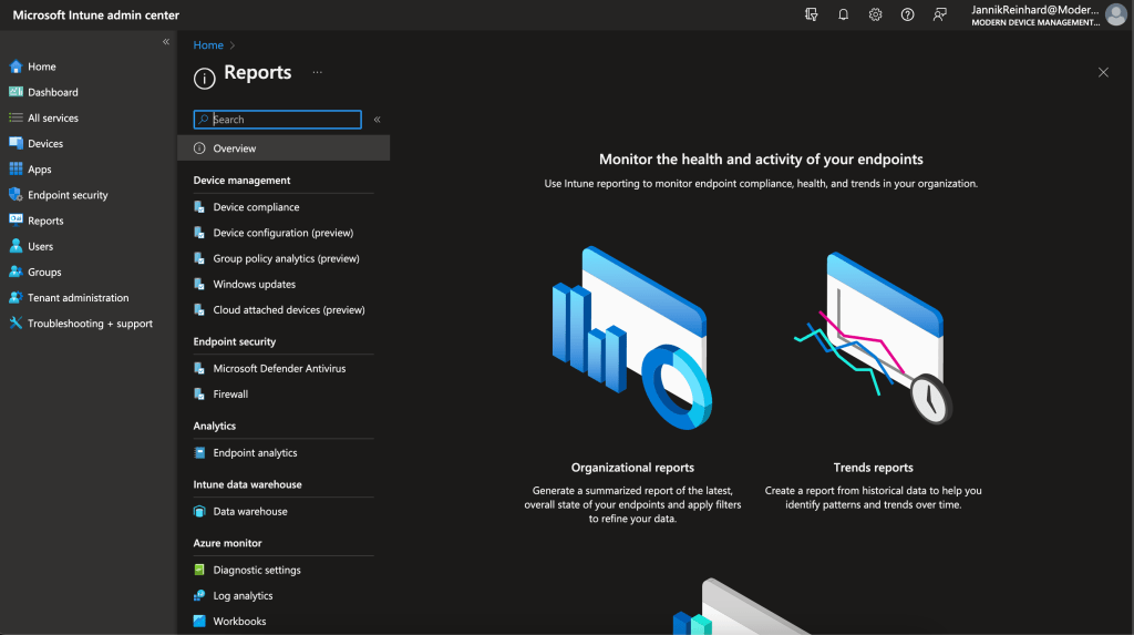 In this new blog post I want to give you an overview hot you can start with reporting analytics with Intune. I already wrote several blogs how to create custom reports via mail or team, to to export and automate things. I also wrote an blog with an overview of the analytics capabilities of Intune. In this post I want to go an step back and want to give you an overview how to start with this topic and which capabilities Intune offers.
